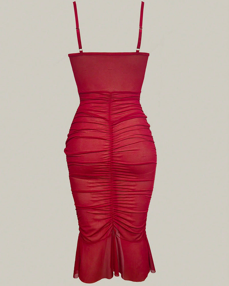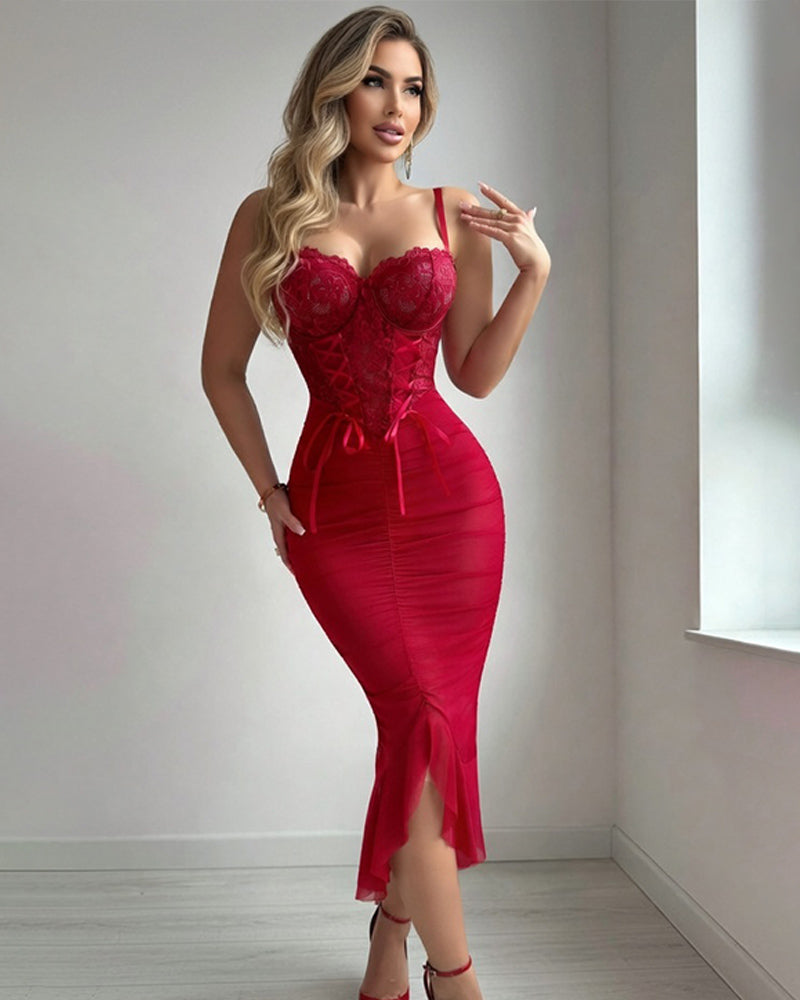 Red Lace Ruched Corset Sheer Midi Bodycon Dress