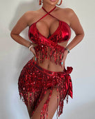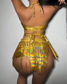 Iridescent Sequin Fringe Halter Crop Top Skirt Set