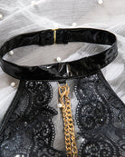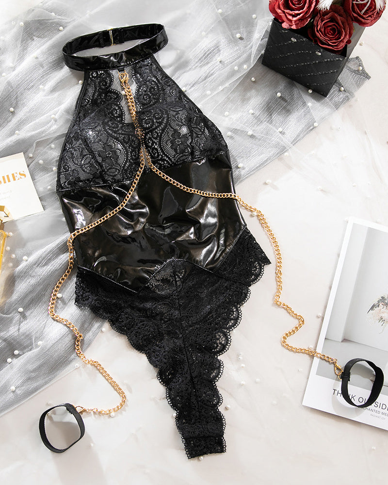 Intense seduction meets bold fetish edge. This striking black lace teddy features a high-gloss PVC halter choker collar, dramatic open-back design with crisscross straps, a deep plunge front framed in intricate floral lace, and luxurious gold chain detailing that drapes from collar to waist — creating a powerful, high-contrast look that commands attention.