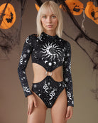 • Channel your cosmic energy with this two-piece cut-out bodysuit. Sporting a high neckline and short sleeves, it boasts a daring knot front detail for a stunning cut-out look.