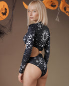 • The black celestial print adds a touch of magic, while elastic around the legs and back keeps you comfortable. Ideal for making a statement at any festival!