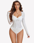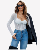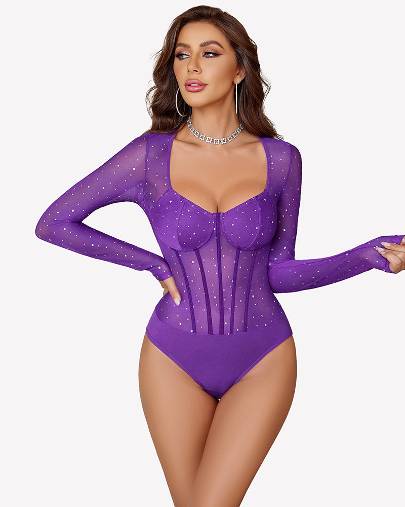 - Sheer bodysuits with snap closure makes it convinient to go to bathroom or put on and take off. Rhinestone sheer mesh body suit top with Lined Chest Area and Bottom looks like a corset style, making you more slim fit and maintaining a elegant and allure look and adds a little uniqueness to the basic bodysuit while covers the bust very well