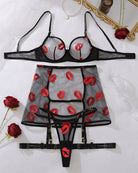 Turns up the seduction with scattered red lip prints, sheer mesh, and delicate harness details.
