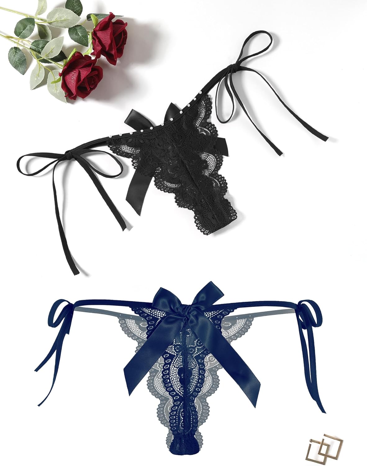 Floral Lace Tangas With Bow And Pearl