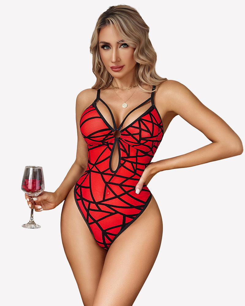 - Premium see-through mesh with striking geometric print creates an irresistible allure.