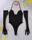 - Black bodysuit with plunging nude mesh panel for a bold, contrast effect
