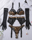 Dessous-Set mit Wimpernstrumpfband und Handschuhen im Leopardenmuster