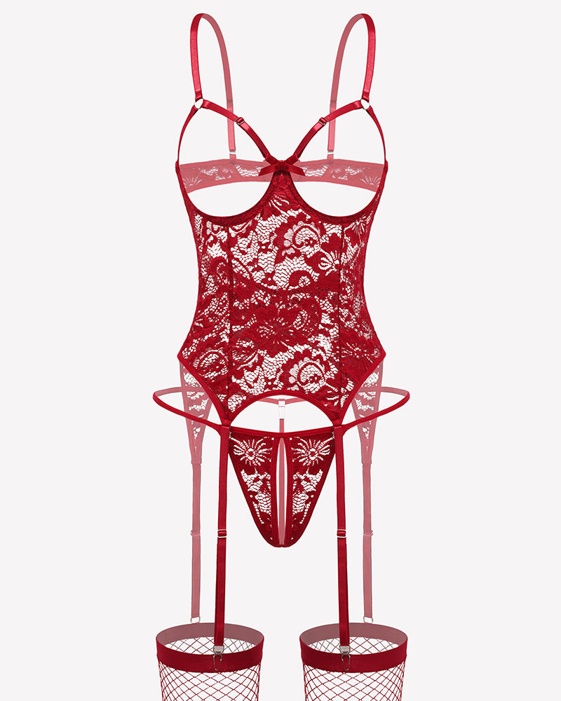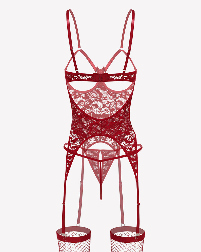 - Package Content: 1 xUnderwire Lace Corset with Garter Belt+1 x Panty+1 Pair of Stockings.