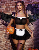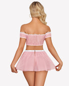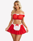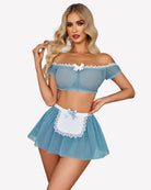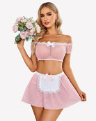 - Stylish Design: This women's lingerie set features an off-shoulder mesh top, a double-layered mini skirt, 1pc apron and a thong. The off-shoulder style adds elegance, while the layered skirt offers texture and movement. The top is accented with contrasting lace trim and a charming bow, giving it a playful yet refined look