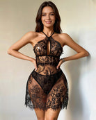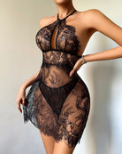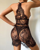 Timeless seduction in delicate lace. This exquisite black halter babydoll features intricate floral lace over sheer mesh, a flattering keyhole plunge neckline, and a romantic scalloped hem that flutters gracefully. The open back and body-skimming fit create an irresistibly feminine and alluring silhouette.
