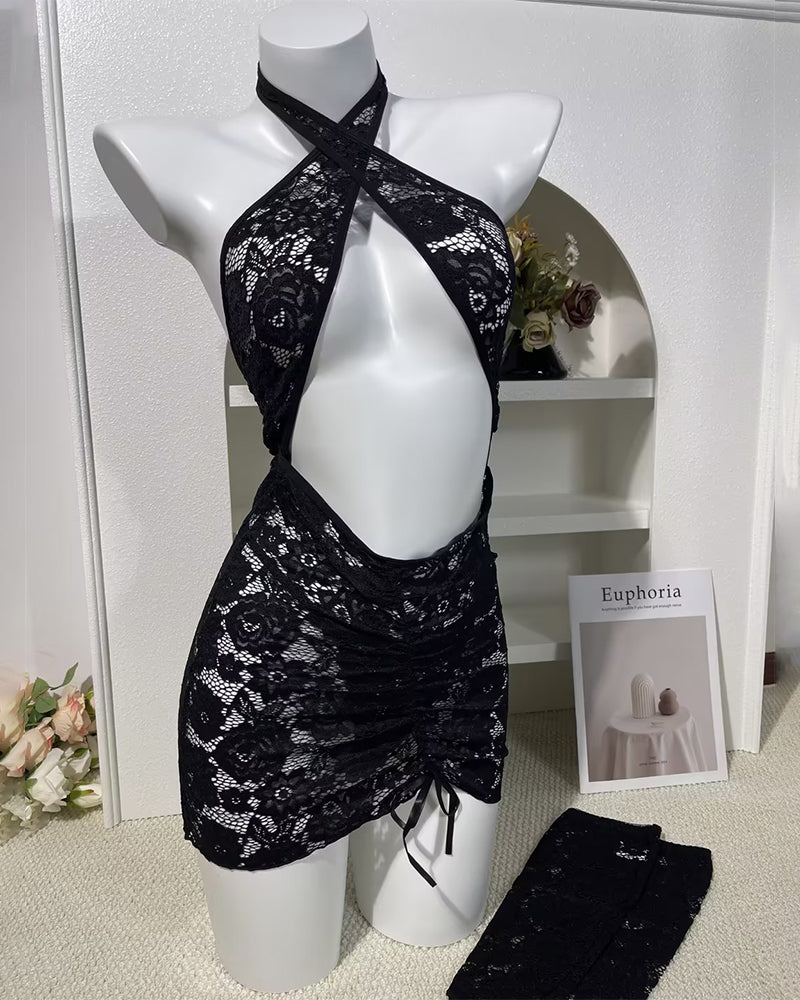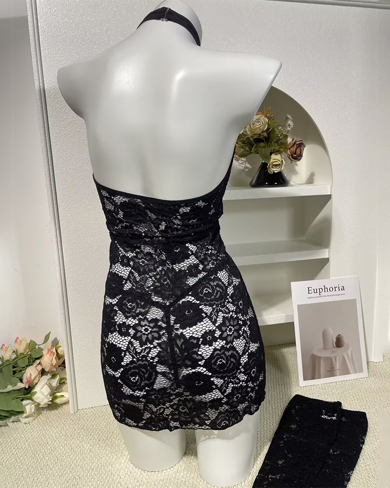 Halter Crisscross Cut Out Bodycon Lace Dress with Gloves