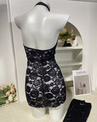 Daring elegance in intricate black floral lace. This seductive halter mini dress features a crisscross halter neckline with a bold front cut-out, ruched detailing for a flattering fit, and matching sheer lace arm sleeves. The figure-hugging silhouette and tie-side detail create an irresistibly sexy look.