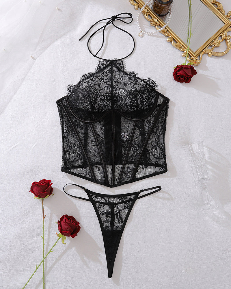 Halter Sheer Mesh Floral Lace Boned Corset with Thong