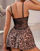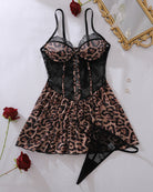 Fierce femininity meets irresistible allure. This seductive leopard print babydoll features a structured corset bodice with delicate black lace and sheer mesh panels that sculpt a flattering hourglass silhouette. The flirty flared mini skirt adds playful movement, while the matching thong completes a bold, confidence-boosting look.