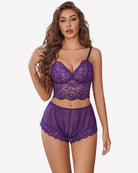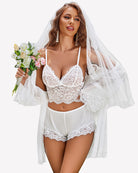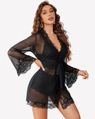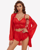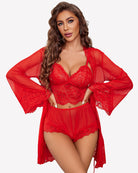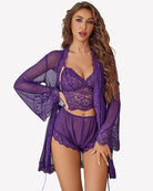 - 3 pieces lingerie set with lace bralette top, matching sheer panty and lingerie robe, stretch and easy to fit which makes it perfectly show your sexy body line and full of temptation