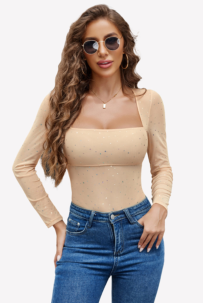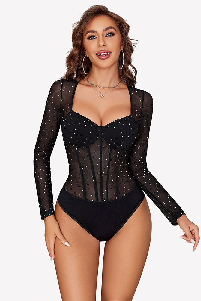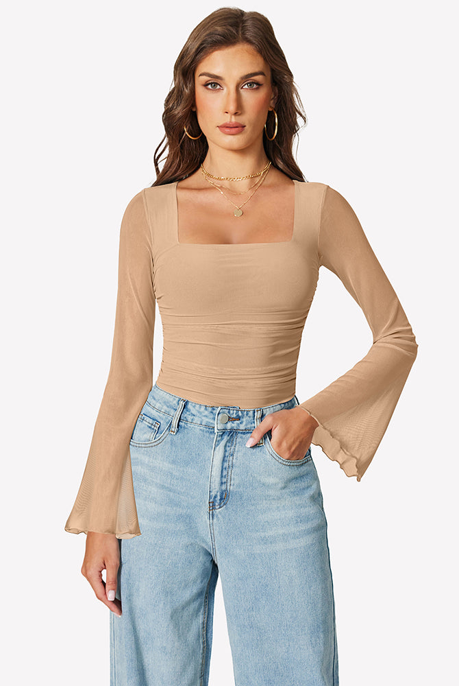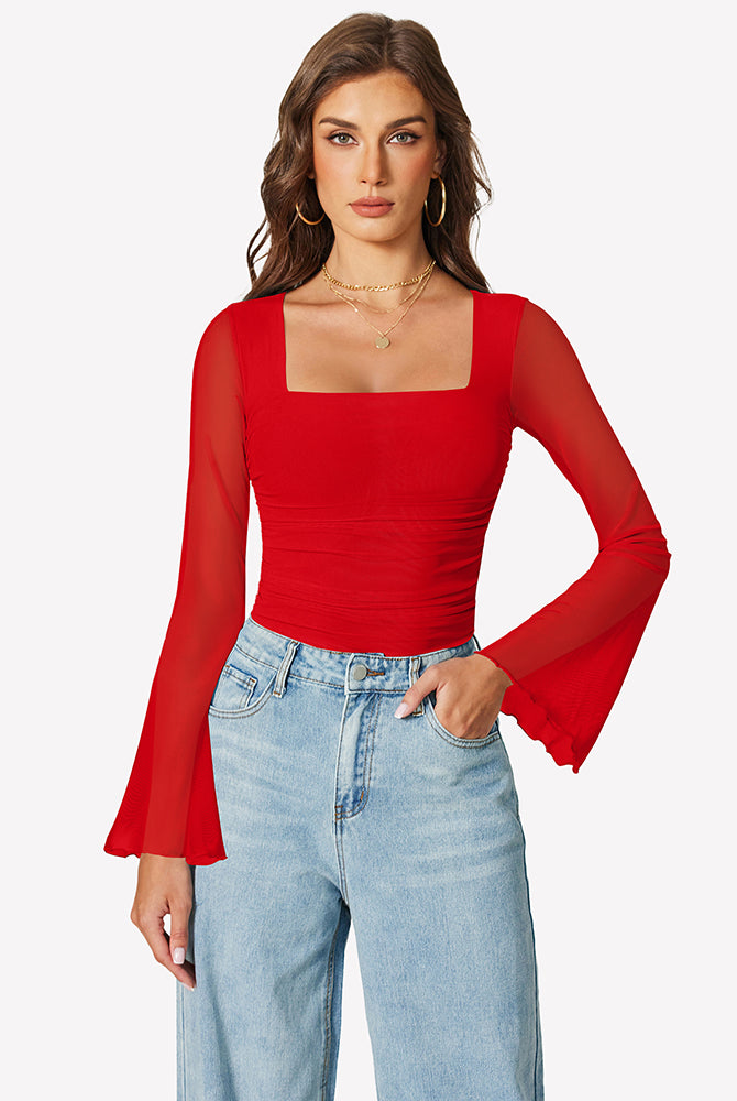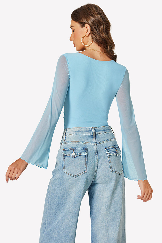 Long Bell Sleeve Mesh Square Neck Bodysuit