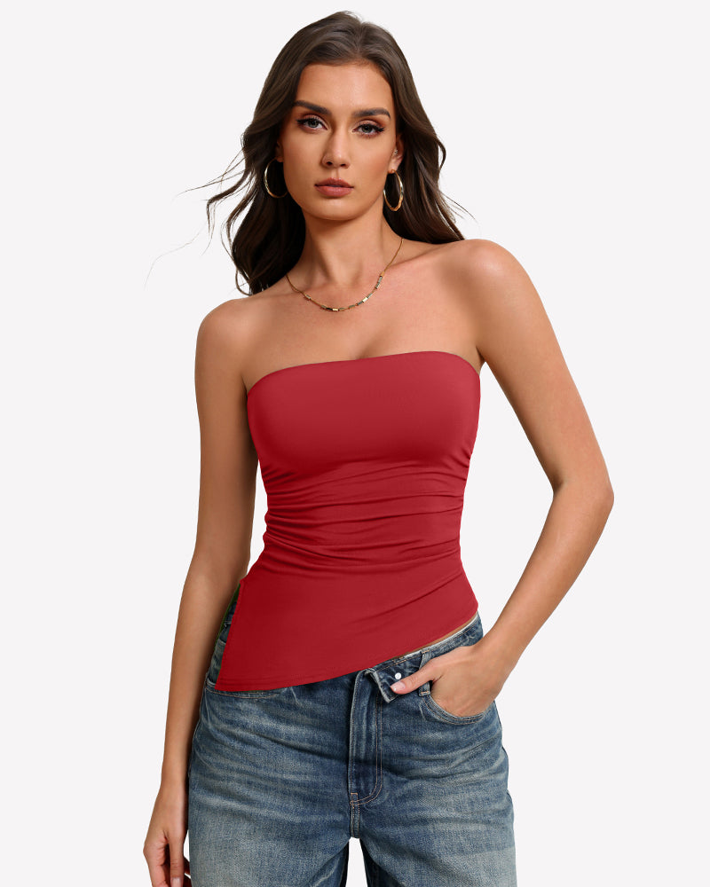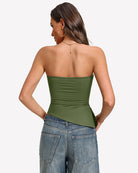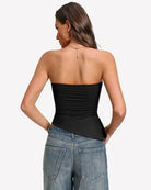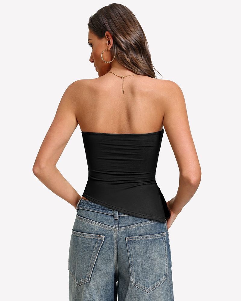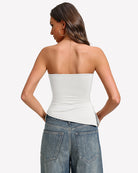 Featuring a backless design, ruched details, and an asymmetrical hemline, it combines allure, femininity, and modern style.