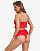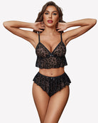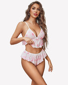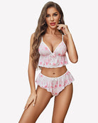 - Design: Mesh camisole top features a sexy deep V-neck, adjustable straps, cute bow at the front, and a loose ruffled hem that's comfortable for all body types pajama shorts features elastic waistband, easy to take on and off, ruffle design add more attractivity