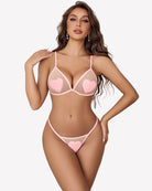 - Design: 2 Piece Lingerie set include mesh bra and panty with cute heart patched, Top features deep V neck, sheer cups, adjustable shoulder straps, sexy panty features a thong design, showing your unique attractive curve